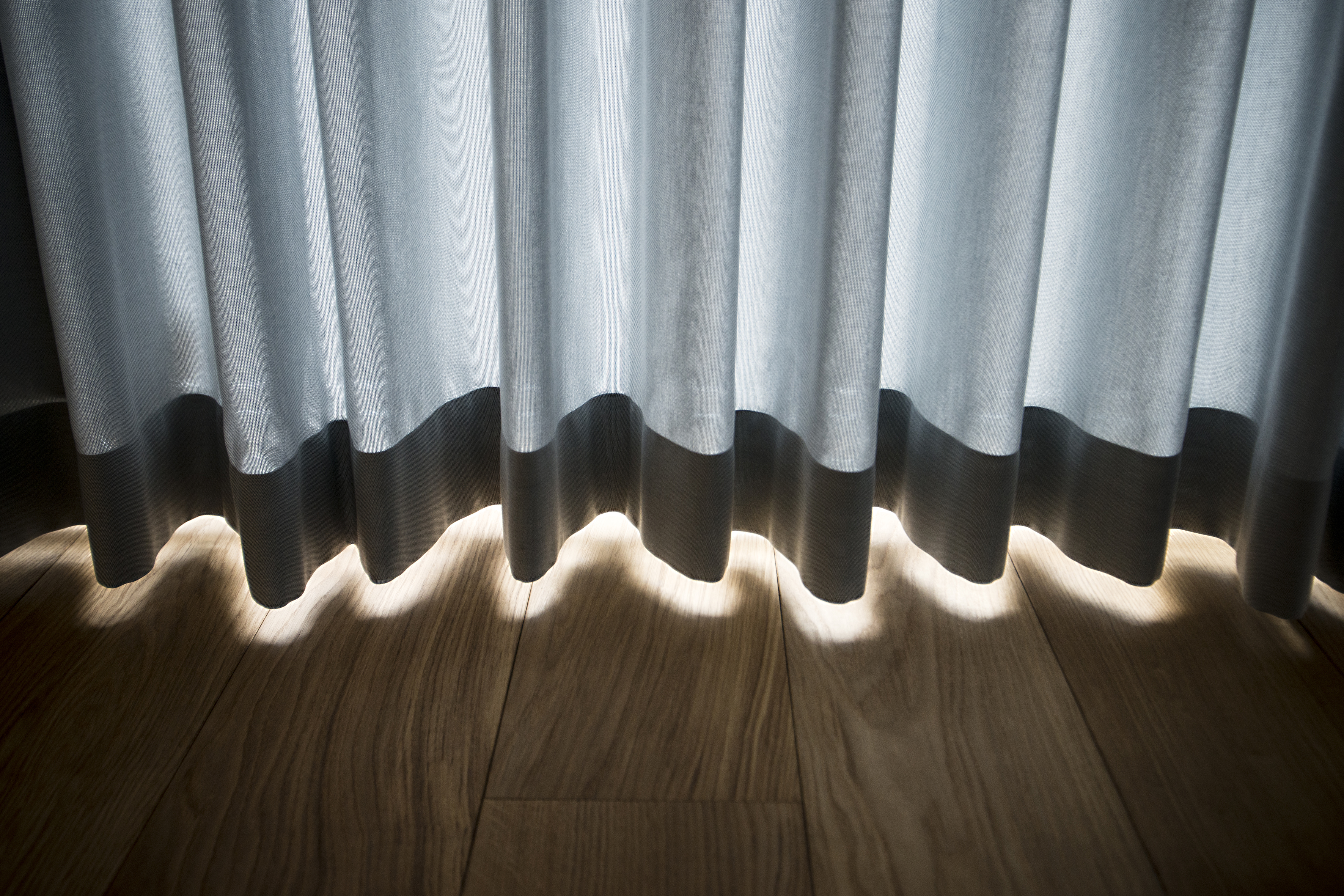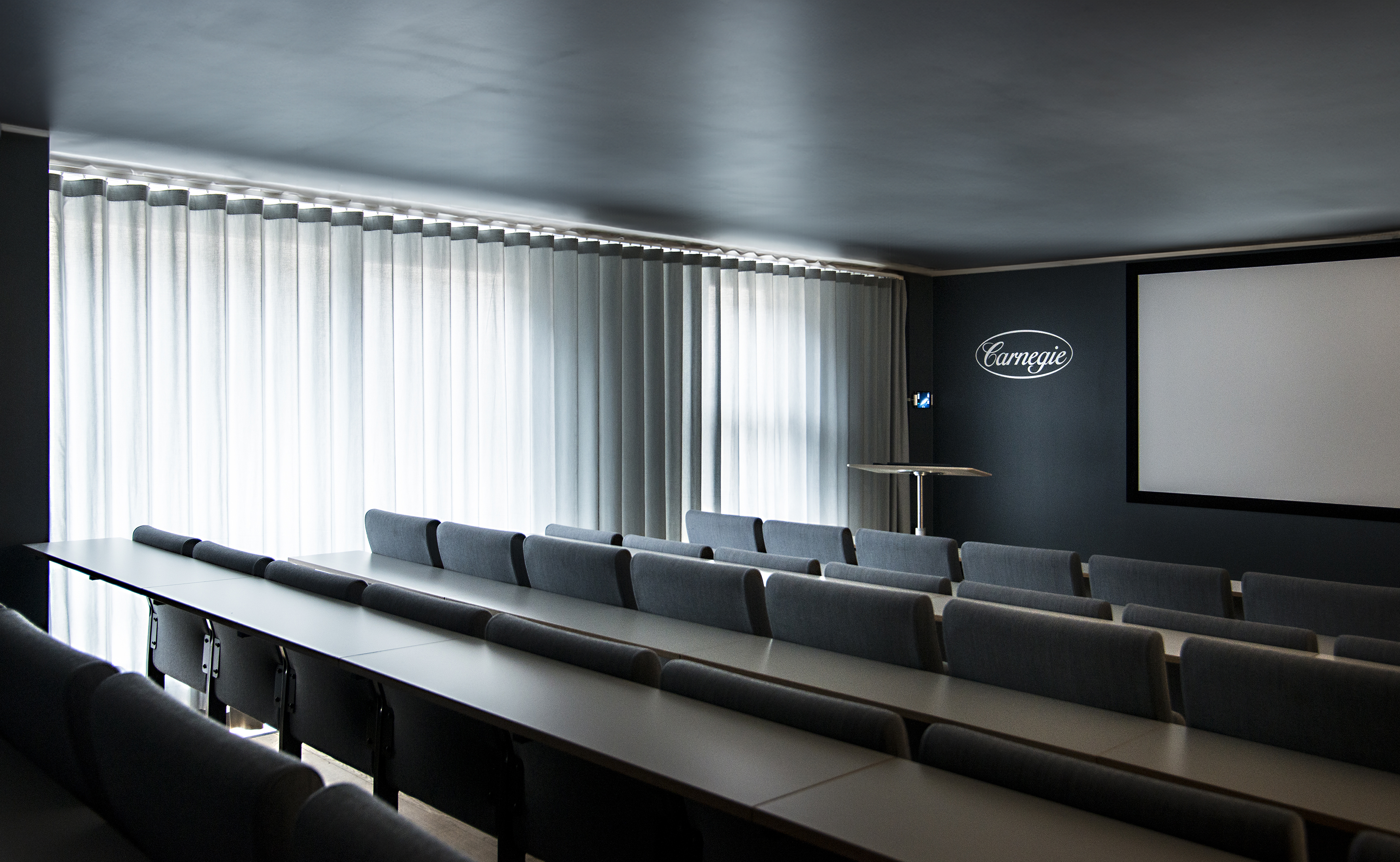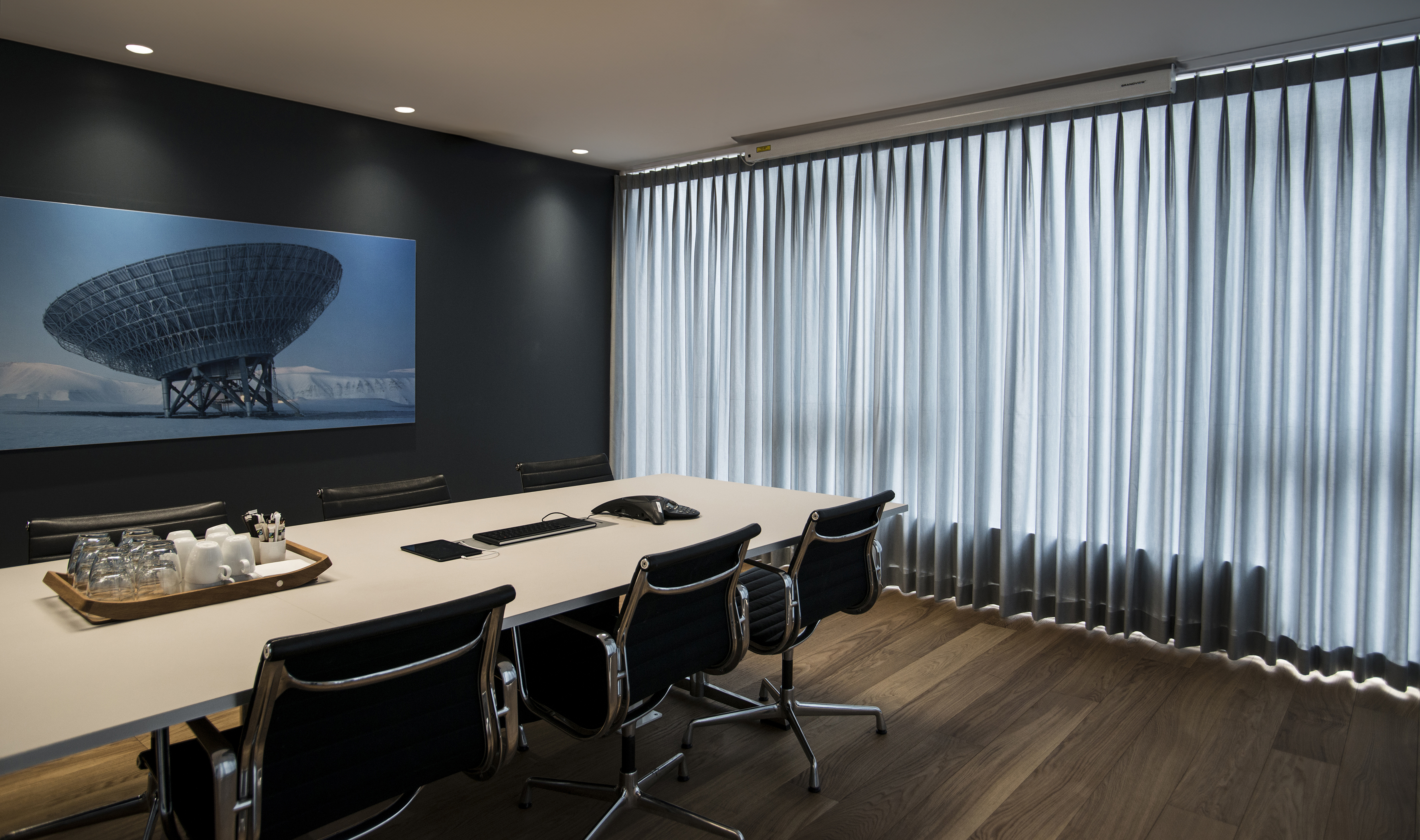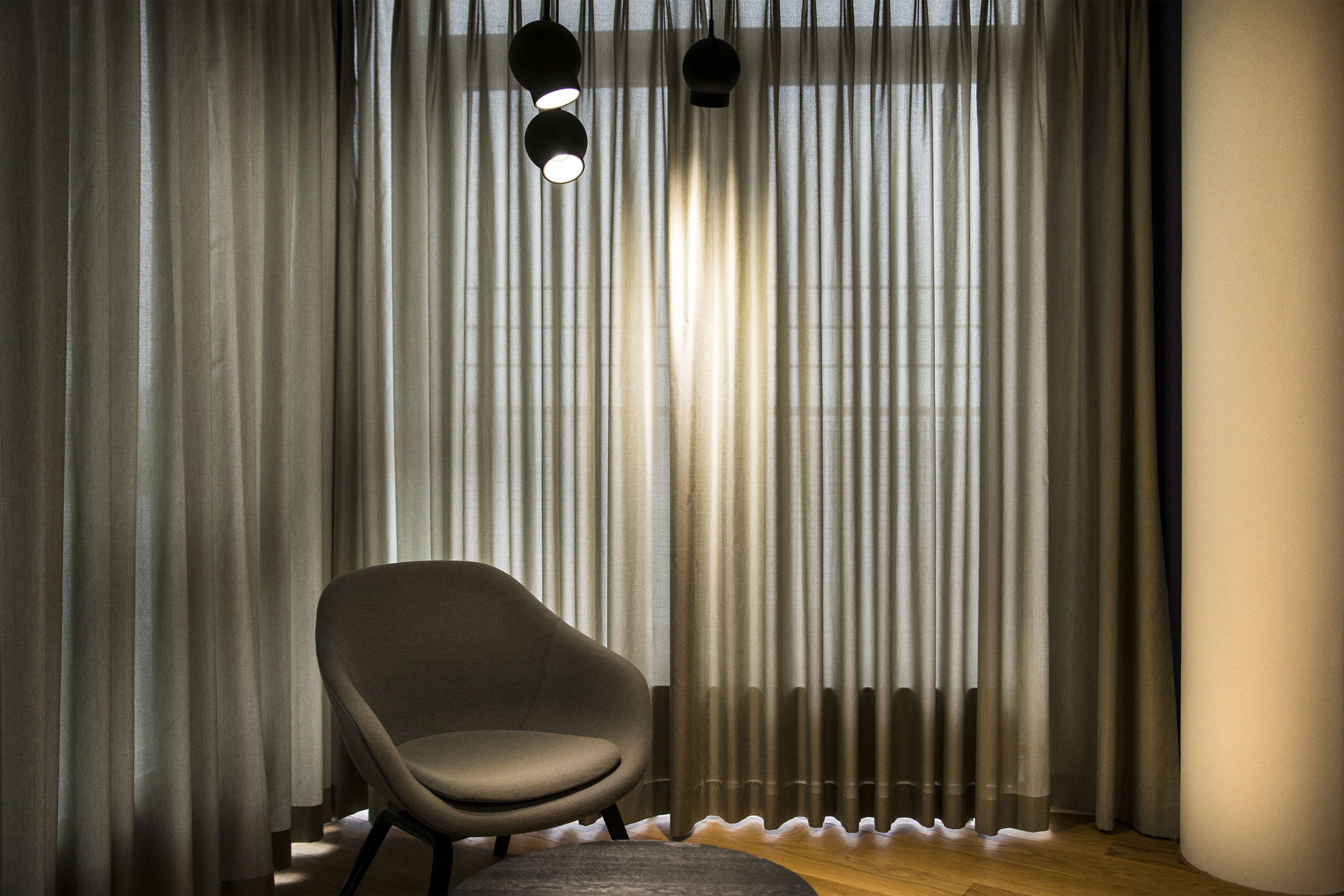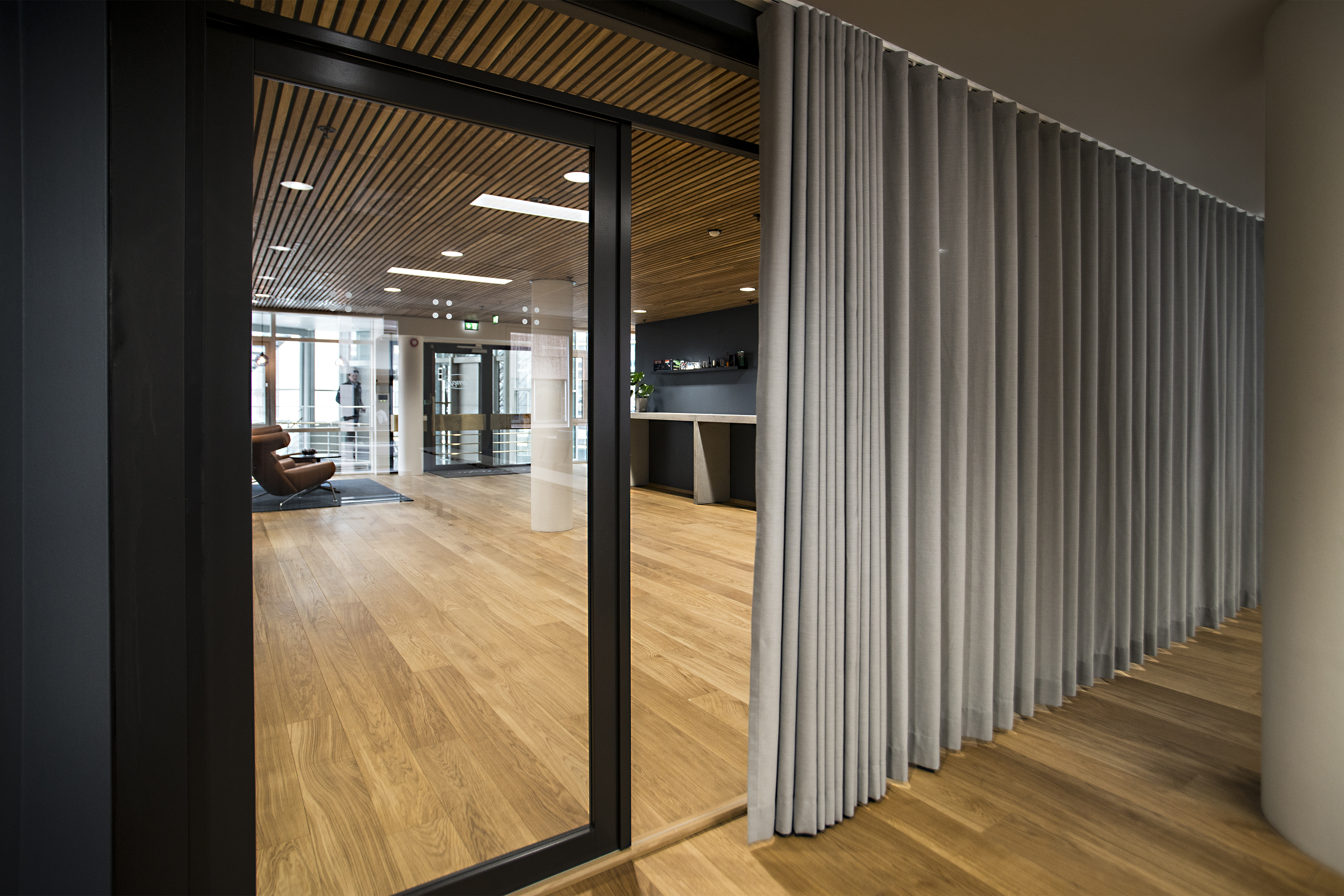 Gardiner til auditorium, kontorer og møderum. Design: Panorama fra Almedahls og Casa fra Kvadrat – i alt 35 meter. Spesialtilpassede skinner og automatikk