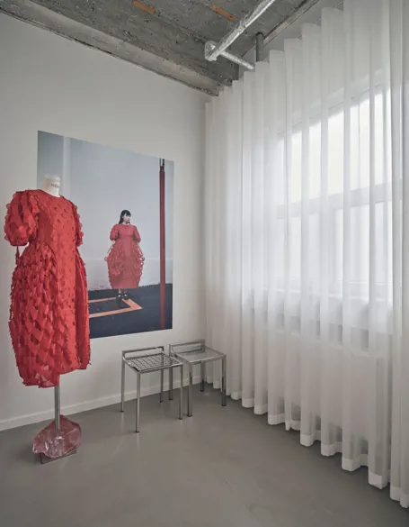 "Vi fant lokalene da vi skulle skyte SS20-kampanjen vår. Vi ble så begeistret for lokalene at vi i etterkant valgte å leie dem til vårt showroom og atelier. Studioet vårt er fordelt i to etasjer, hvor utstillingene våre ligger øverst på toppen under vakre hvelvede tak" forteller Birgitte Boye, Head of Marketing & PR for Cecilie Bahnsen, som vi snakket med da vi ankom hovedkvarteret deres på Østerbro.