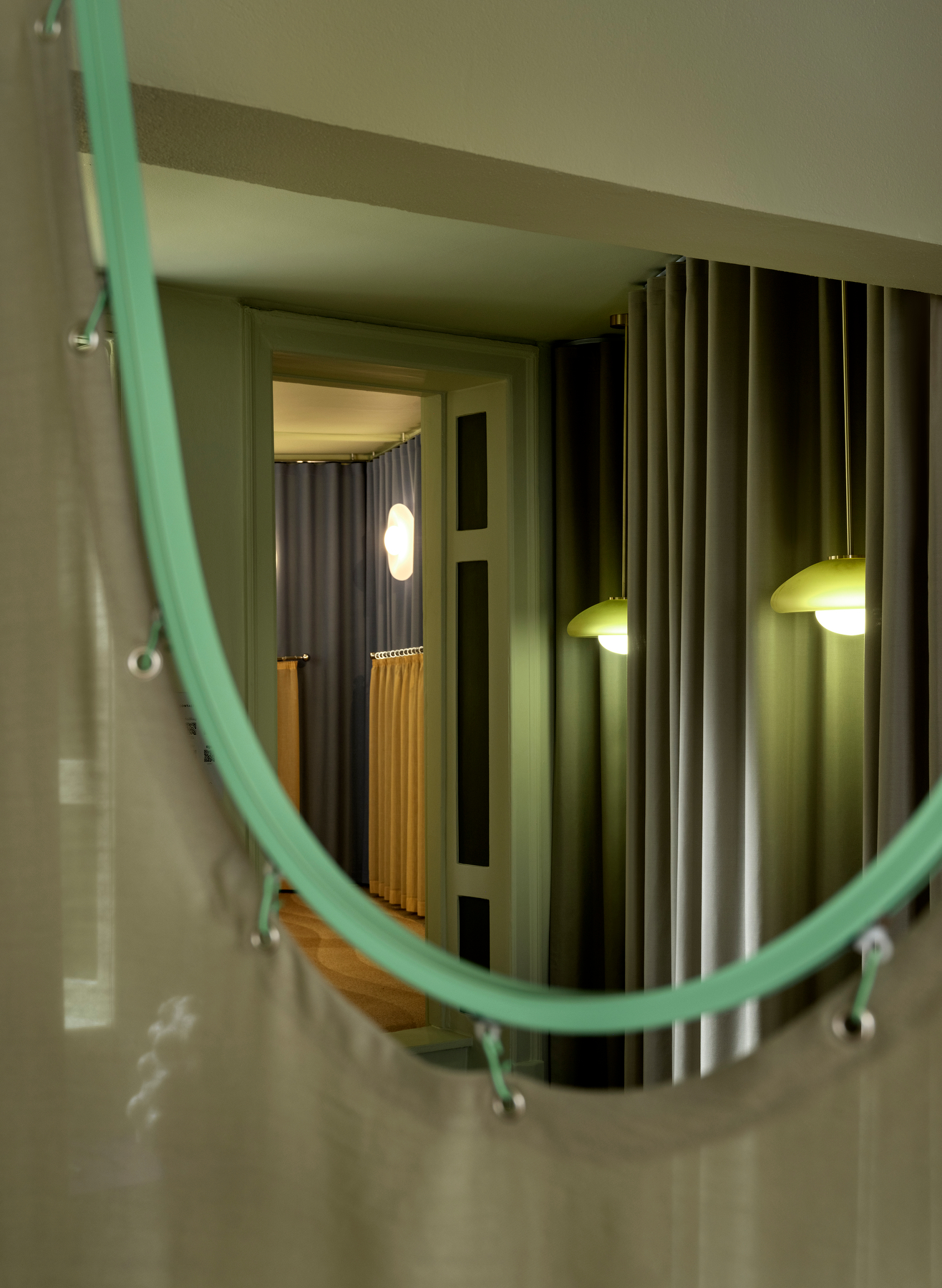 "I porten utenfor lokalet ble det hengt opp gardiner med asymmetriske snitt, og inne ble gardinene brukt til å dele inn rom i flere mindre rom. To gardiner ble for eksempel til en lang gang, mens andre gardiner fylte en hel bakvegg og noen svevde fritt i 130 cm høyde," forteller salgsdirektør hos Fischer, Anders Back Christensen.