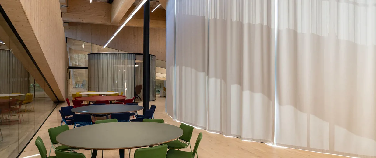 Gardinløsningen i The Plus understøtter den transparente arkitekturen og bidrar samtidig til et velfungerende arbeidsmiljø.