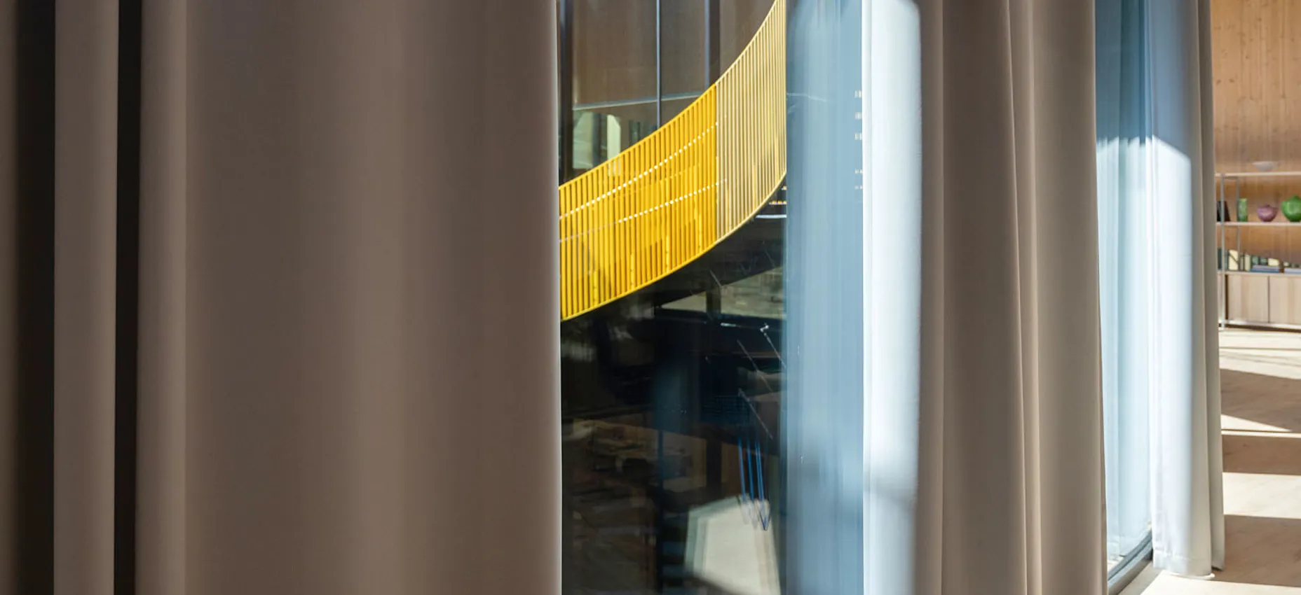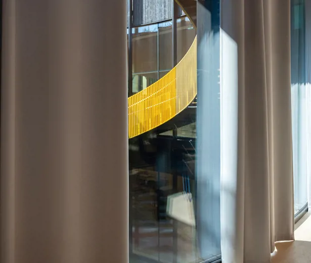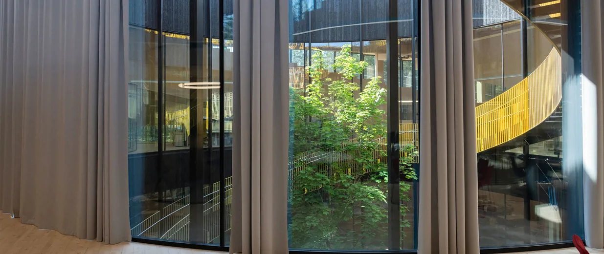 KvintBlendex har montert lange gardiner til gulvet som balanserer dagslys, utsyn og komfort i en bygning hvor åpenhet er et grunnleggende arkitektonisk grep.