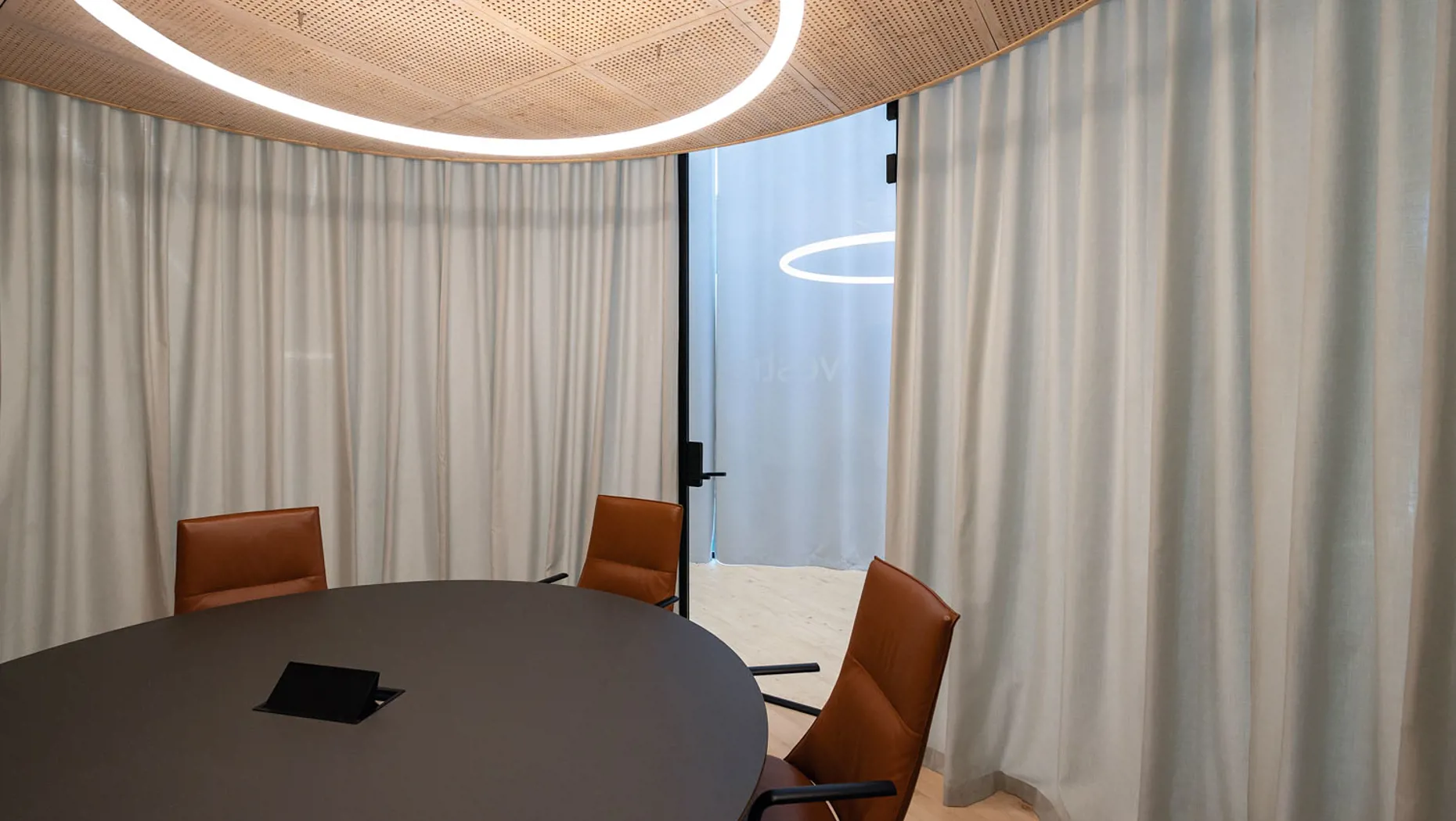“ I de runde møterommene, som er utformet som glassylindere, var behovet å kunne skjerme for innsyn under møteaktivitet uten å stenge dagslyset ute. Her er det valgt et tett, men transparent tekstil som både sikrer diskresjon og bidrar til forbedret akustikk. Fargevalget er holdt nøytralt og avstemt med bygningens øvrige materialer,“