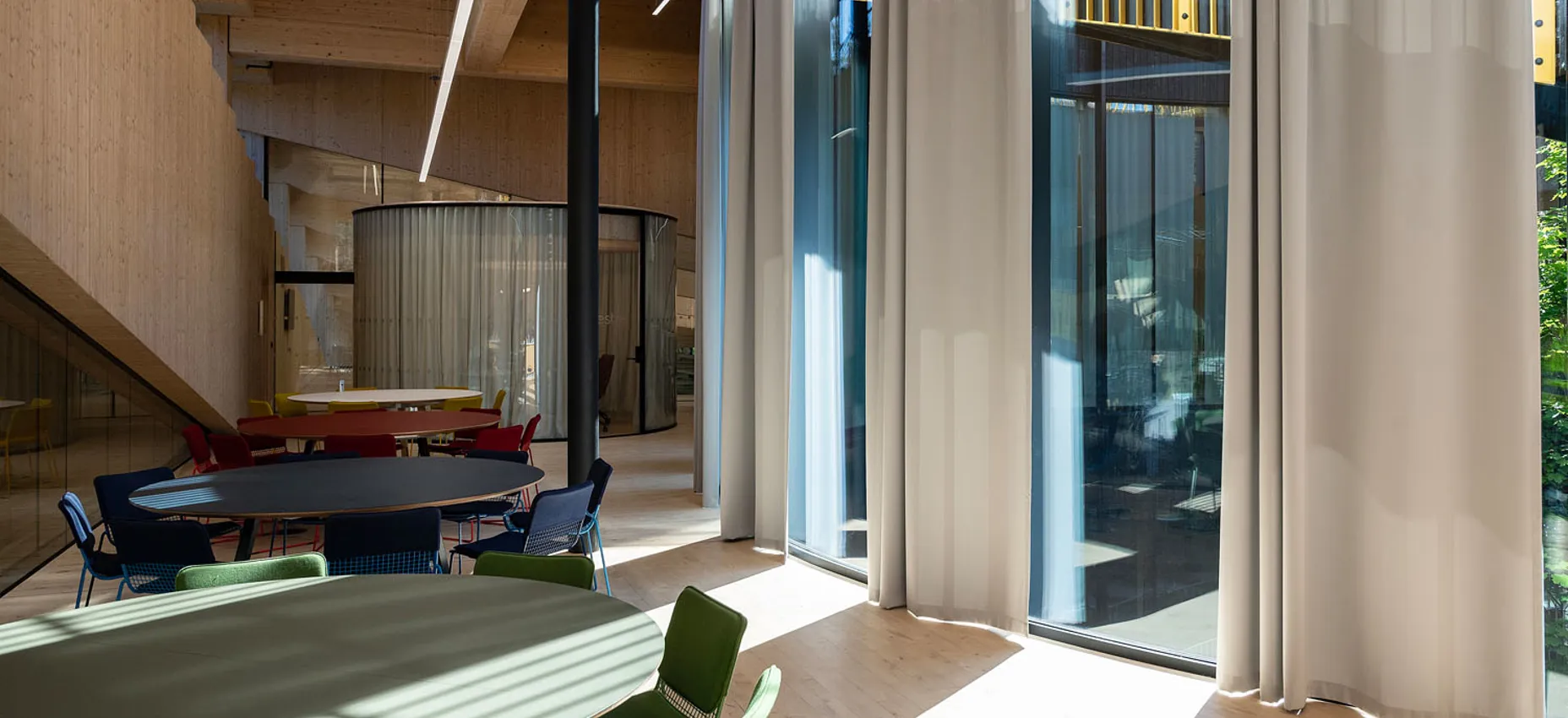 Gardinløsningene i The Plus samler dagslys, avskjerming og akustikk i en sammenhengende løsning som understøtter bygningens transparente arkitektur.