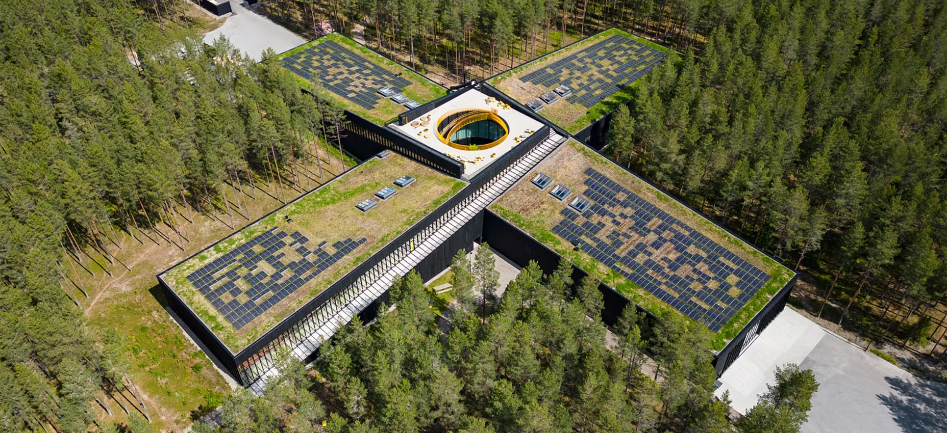Langs bygningens store, innvendige glassfasader er kontorplassene plassert med direkte utsyn til skog og natur. Dagslyset er en sentral del av romopplevelsen, men stiller samtidig krav til solskjerming for å redusere blending og varme.