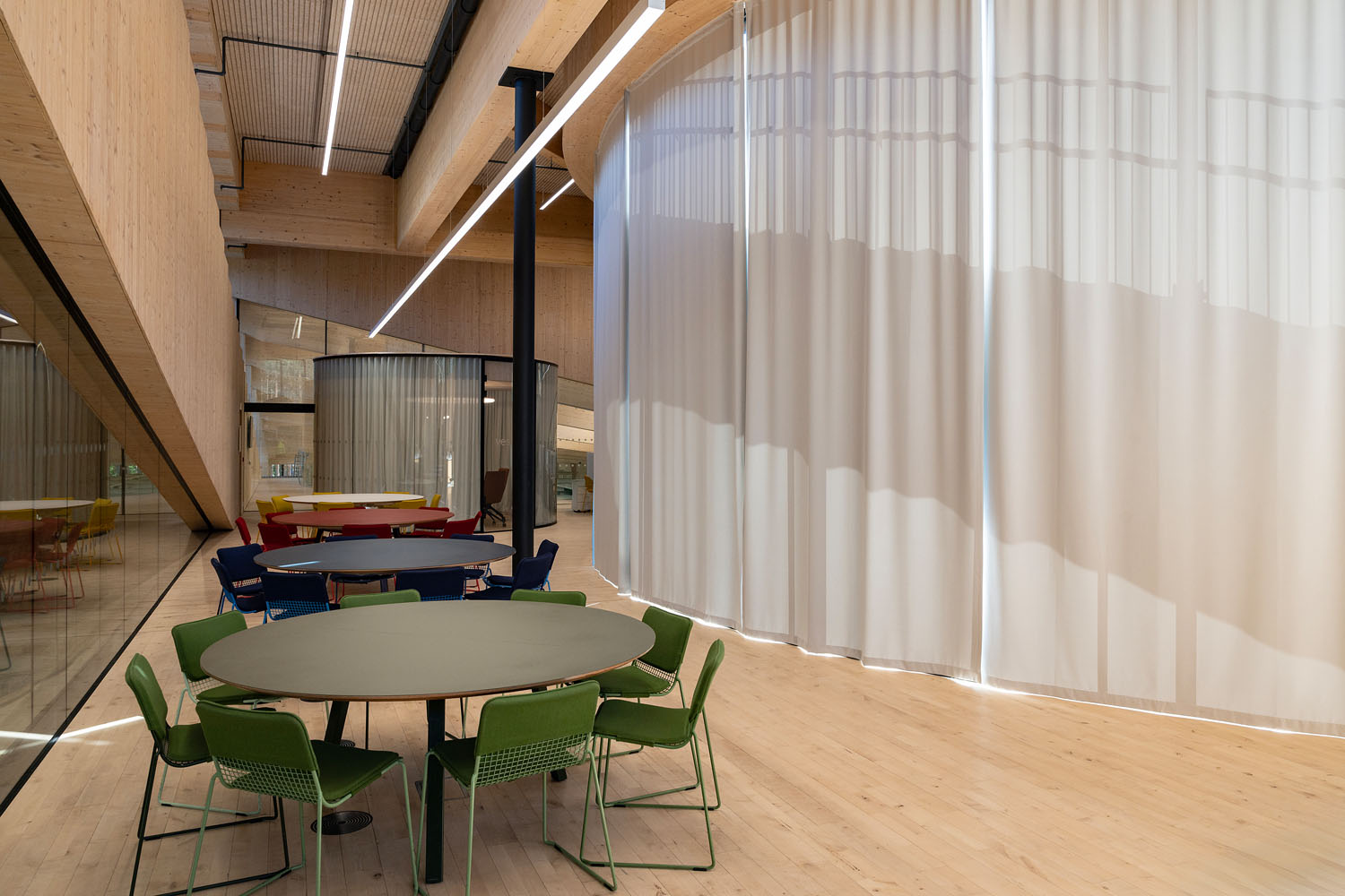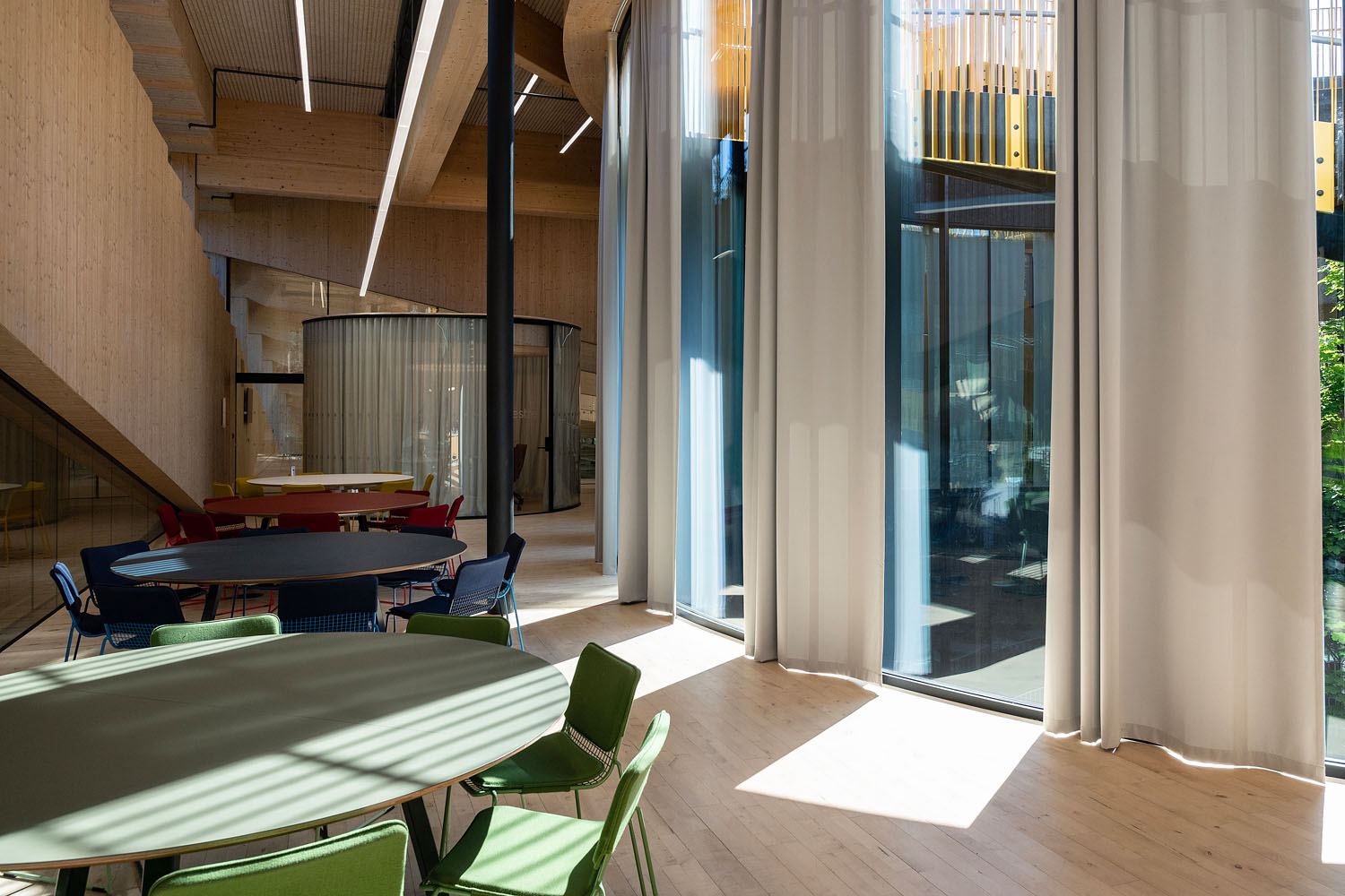 Gardinløsningene i The Plus samler dagslys, avskjerming og akustikk i en sammenhengende løsning som understøtter bygningens transparente arkitektur.