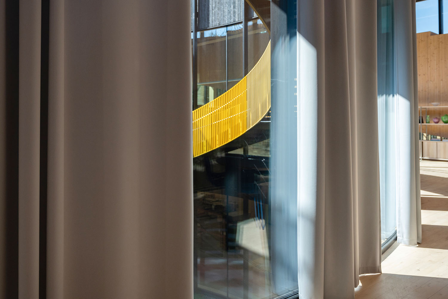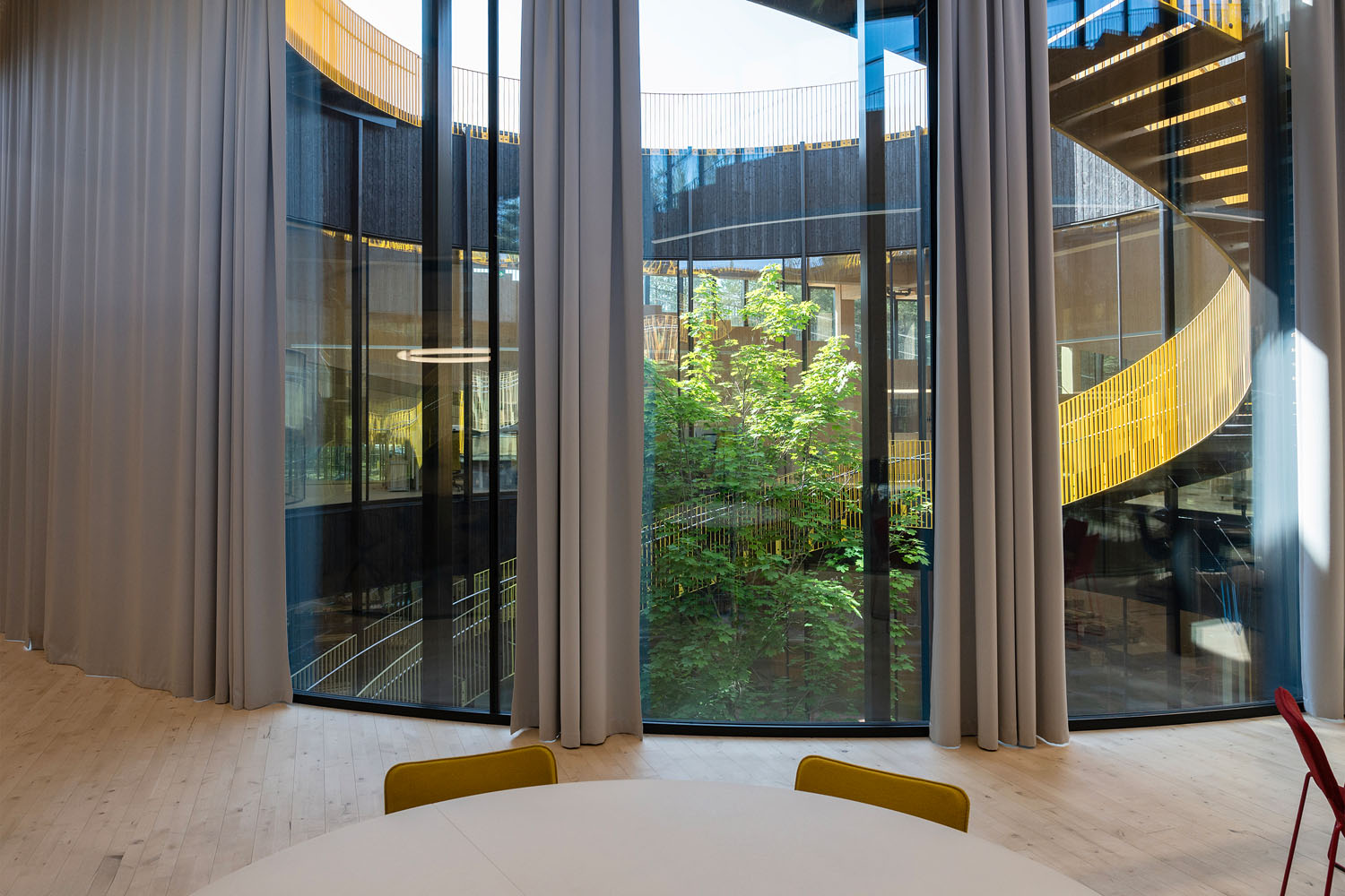 KvintBlendex har montert lange gardiner til gulvet som balanserer dagslys, utsyn og komfort i en bygning hvor åpenhet er et grunnleggende arkitektonisk grep.