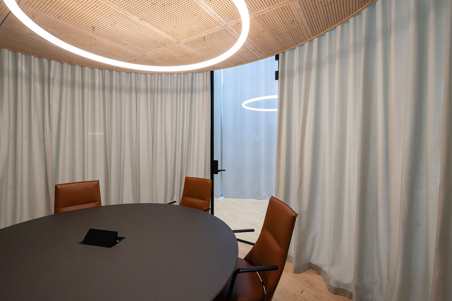 “ I de runde møterommene, som er utformet som glassylindere, var behovet å kunne skjerme for innsyn under møteaktivitet uten å stenge dagslyset ute. Her er det valgt et tett, men transparent tekstil som både sikrer diskresjon og bidrar til forbedret akustikk. Fargevalget er holdt nøytralt og avstemt med bygningens øvrige materialer,“