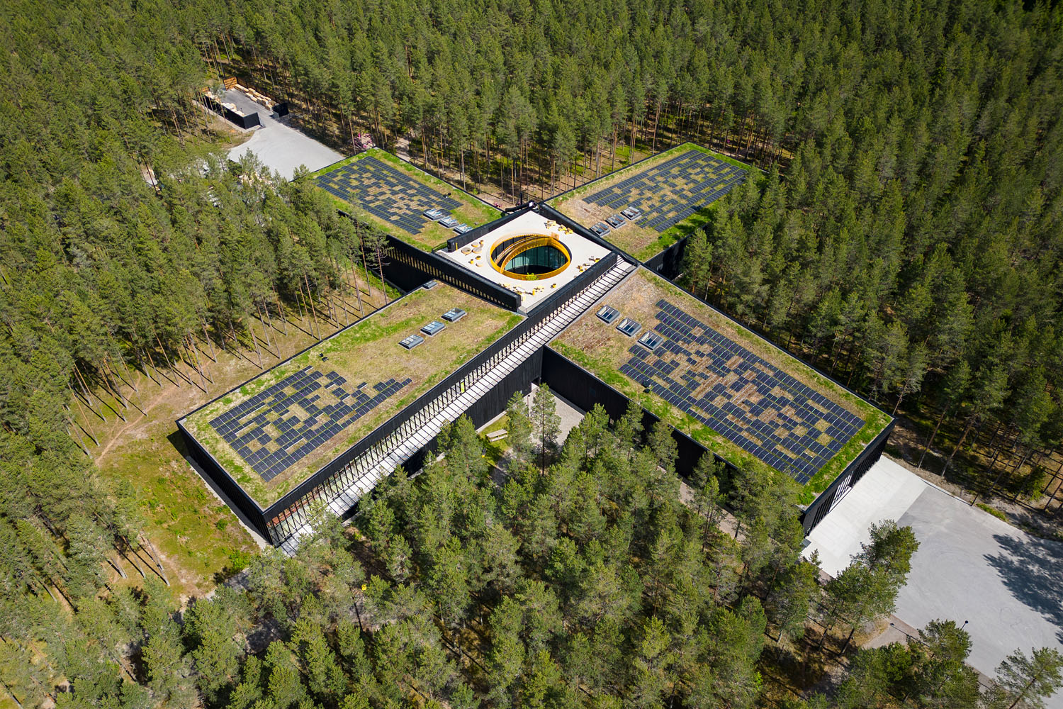 Langs bygningens store, innvendige glassfasader er kontorplassene plassert med direkte utsyn til skog og natur. Dagslyset er en sentral del av romopplevelsen, men stiller samtidig krav til solskjerming for å redusere blending og varme.