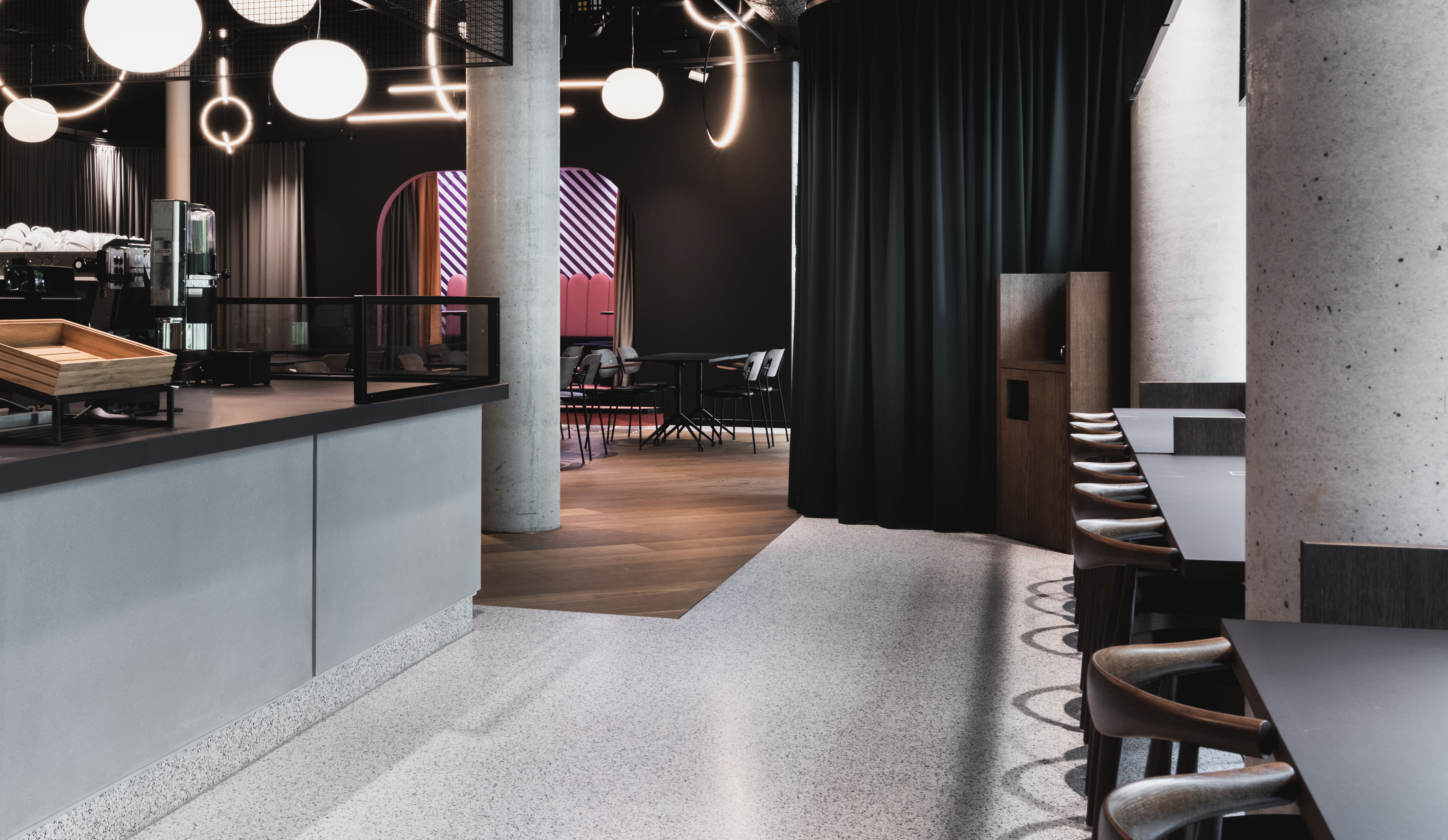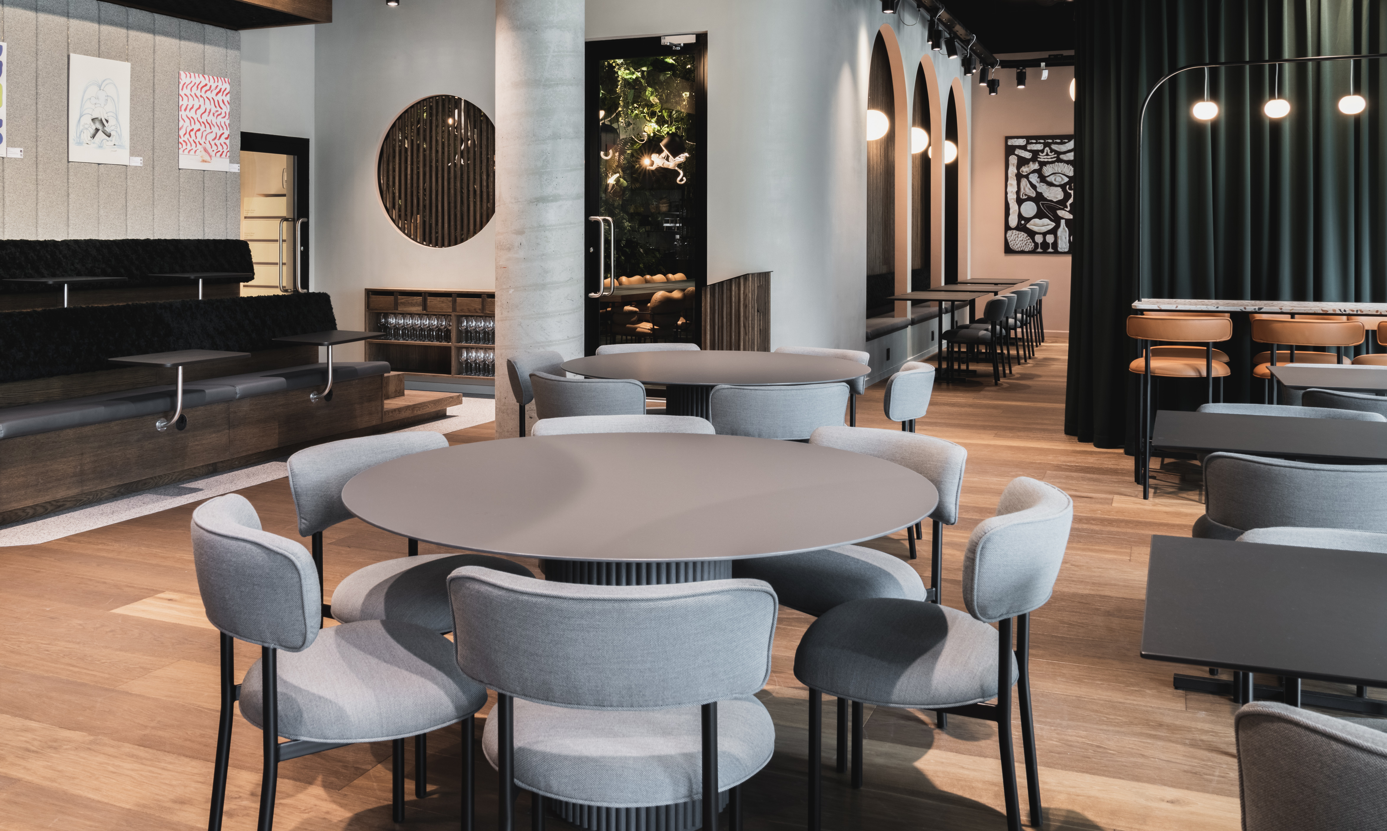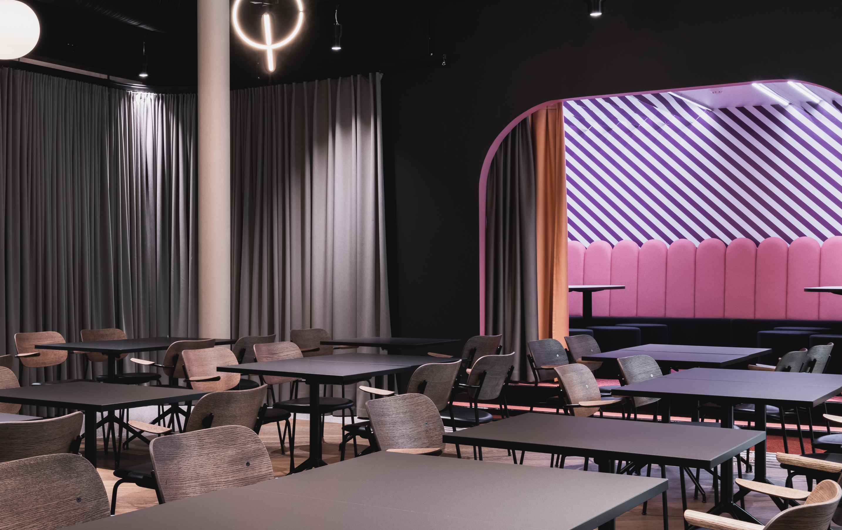 Romdeler i ansatt restaurant. Gardin i Chambre separe og Candyboot. Tekstilet er Dawn fra Kvadrat.