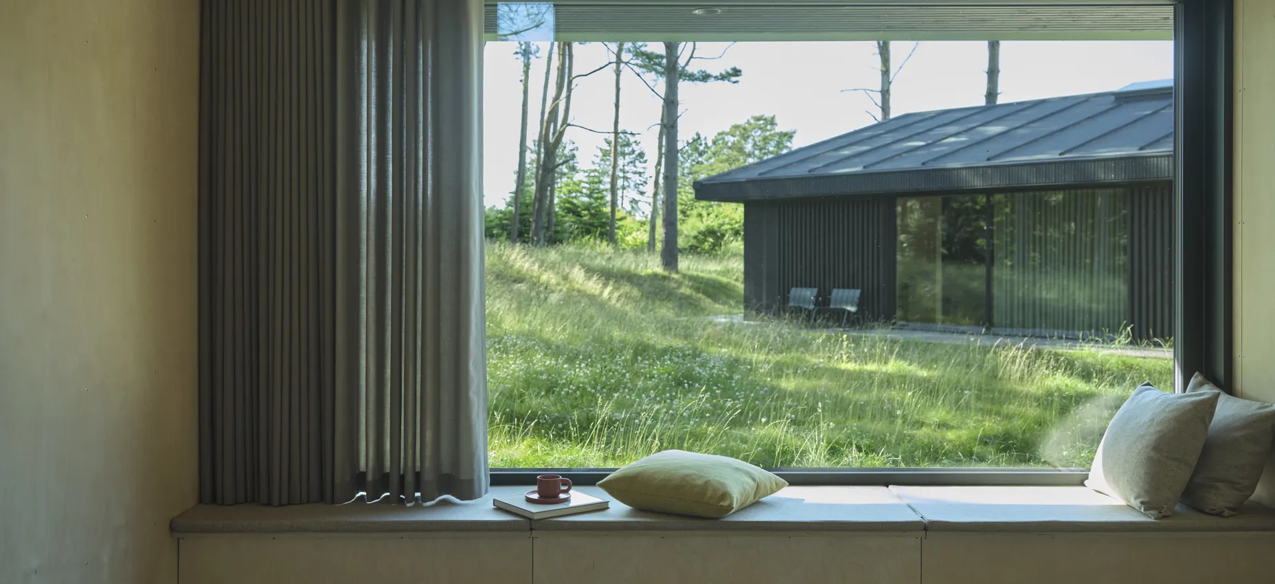 Kurage-tekstiler er kjent for sin holdbarhet, akkurat som Lars’ skreddersydde møbler. Derfor valgte familien i tillegg til gardiner å trekke to vindusbenker med Kurage-stoff. De inkluderte også en puff og flere puter fra Kurages elegante kolleksjon av myke interiørtekstiler.