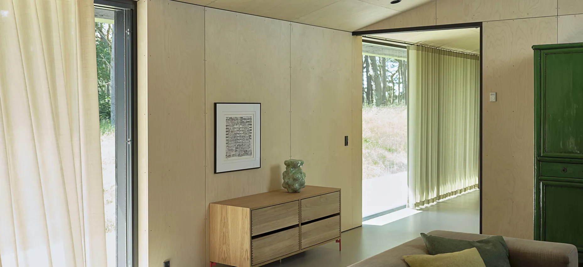 "Mitt hjem representerer i stor grad Woodform-identiteten. WOODFORM House er et bærekraftig hus konstruert av tre, både innvendig og utvendig. Jeg nyter varmen som utstråles fra de naturlige og unike organiske overflatene. For eksempel er våre vegger og tak ikke hvite, men kledd med bjørkefinér. Gardinene, putene og sitteputene våre er vevd av resirkulerte fibre og passer perfekt til vårt hjem," sier Lars Christian Poulsen.