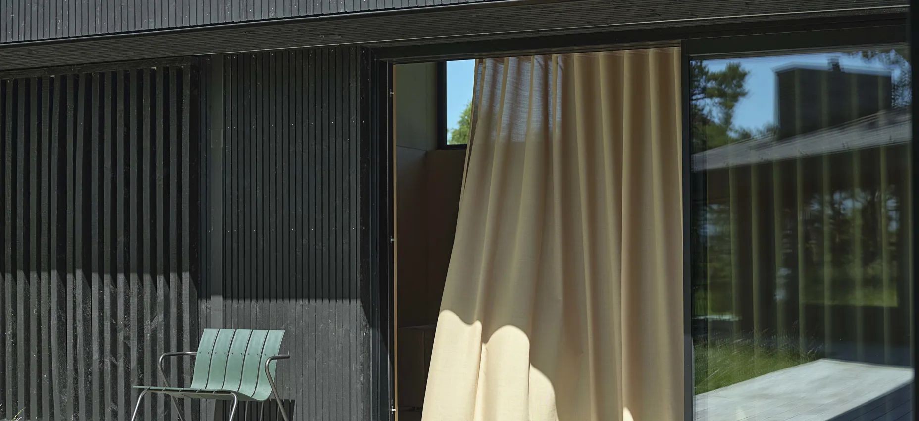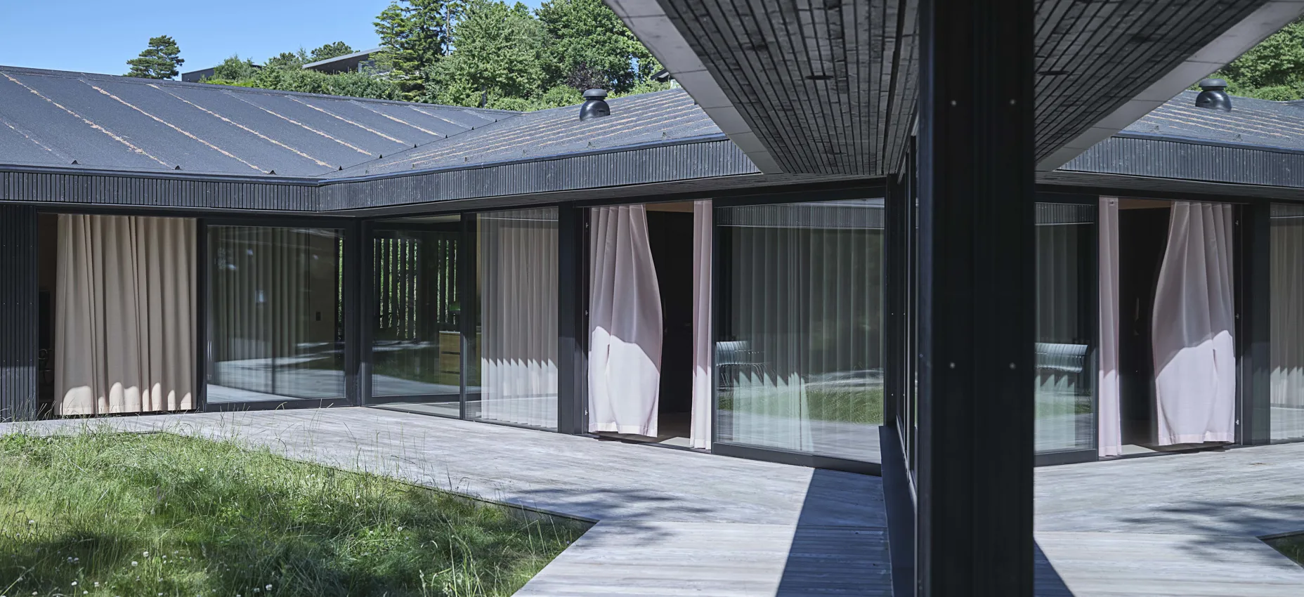 Fischers salgskonsulent hjalp til med å finne gardiner og solskjerming som samsvarte med både arkitektens visjon og familiens ønsker. På soverommene ble det installert spesialtilpassede blendingsgardiner sammen med lysdempende Kurage Casual Dense-gardiner. Den mer transparente versjonen, Casual Light, ble valgt til stuen, peisestuen, kjøkkenet og gangen.