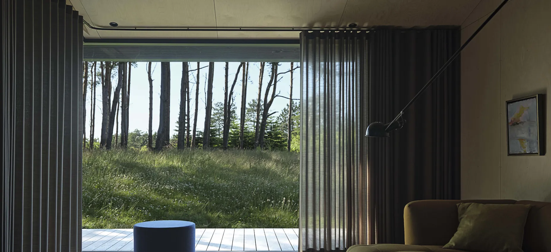 WOODFORM House er fullstendig avskjermet fra nysgjerrige naboer. Likevel valgte familien å sette opp gardiner i peisestuen. Når de trekkes for, tilfører gardinene rommet myke og organiske former, som forsterkes av den buede gardinstangen. Vi tilbyr skreddersydde gardinstenger i former og farger som elegant matcher stoffet i dine nye, myke gardiner.