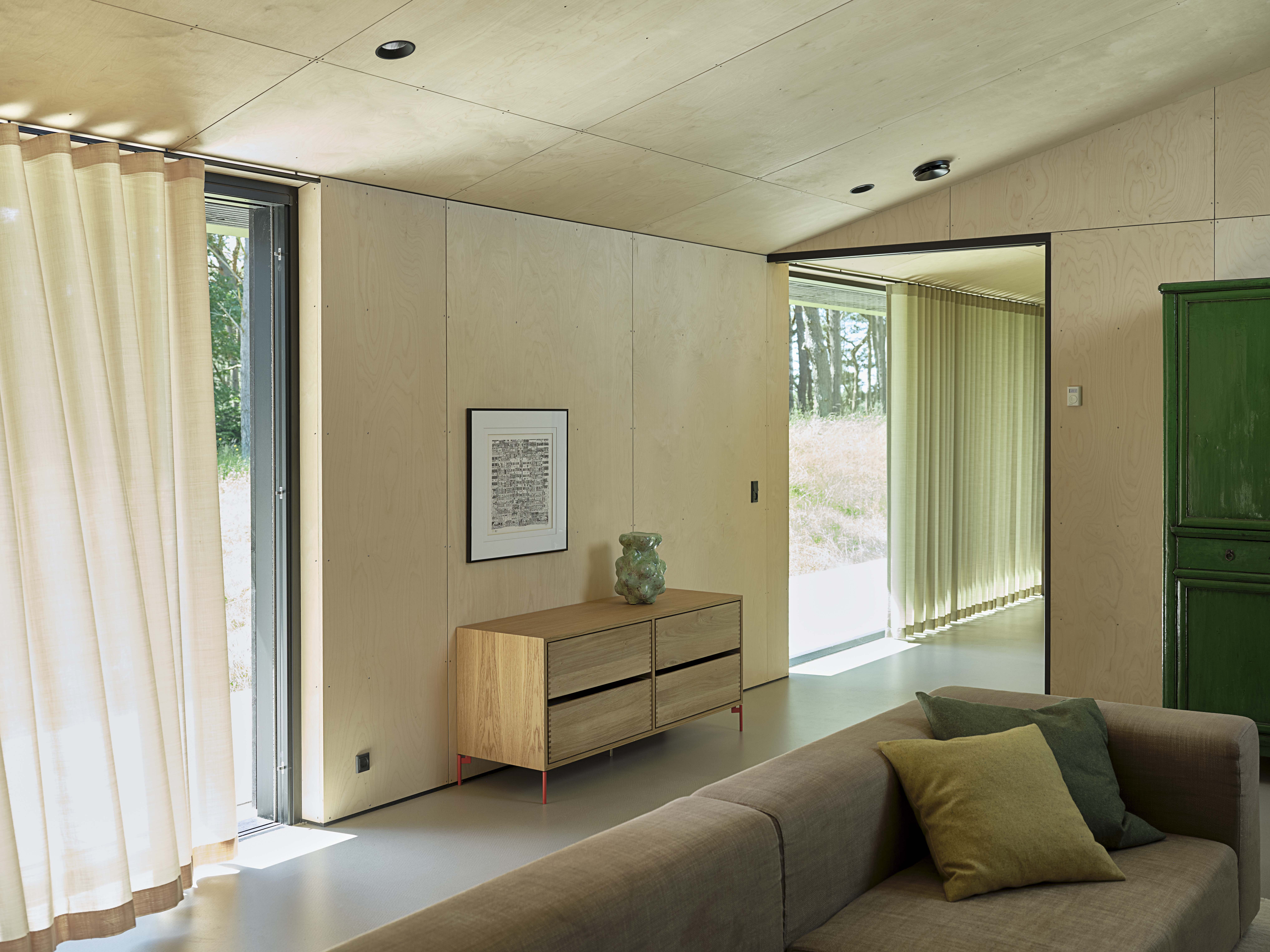 "Mitt hjem representerer i stor grad Woodform-identiteten. WOODFORM House er et bærekraftig hus konstruert av tre, både innvendig og utvendig. Jeg nyter varmen som utstråles fra de naturlige og unike organiske overflatene. For eksempel er våre vegger og tak ikke hvite, men kledd med bjørkefinér. Gardinene, putene og sitteputene våre er vevd av resirkulerte fibre og passer perfekt til vårt hjem," sier Lars Christian Poulsen.